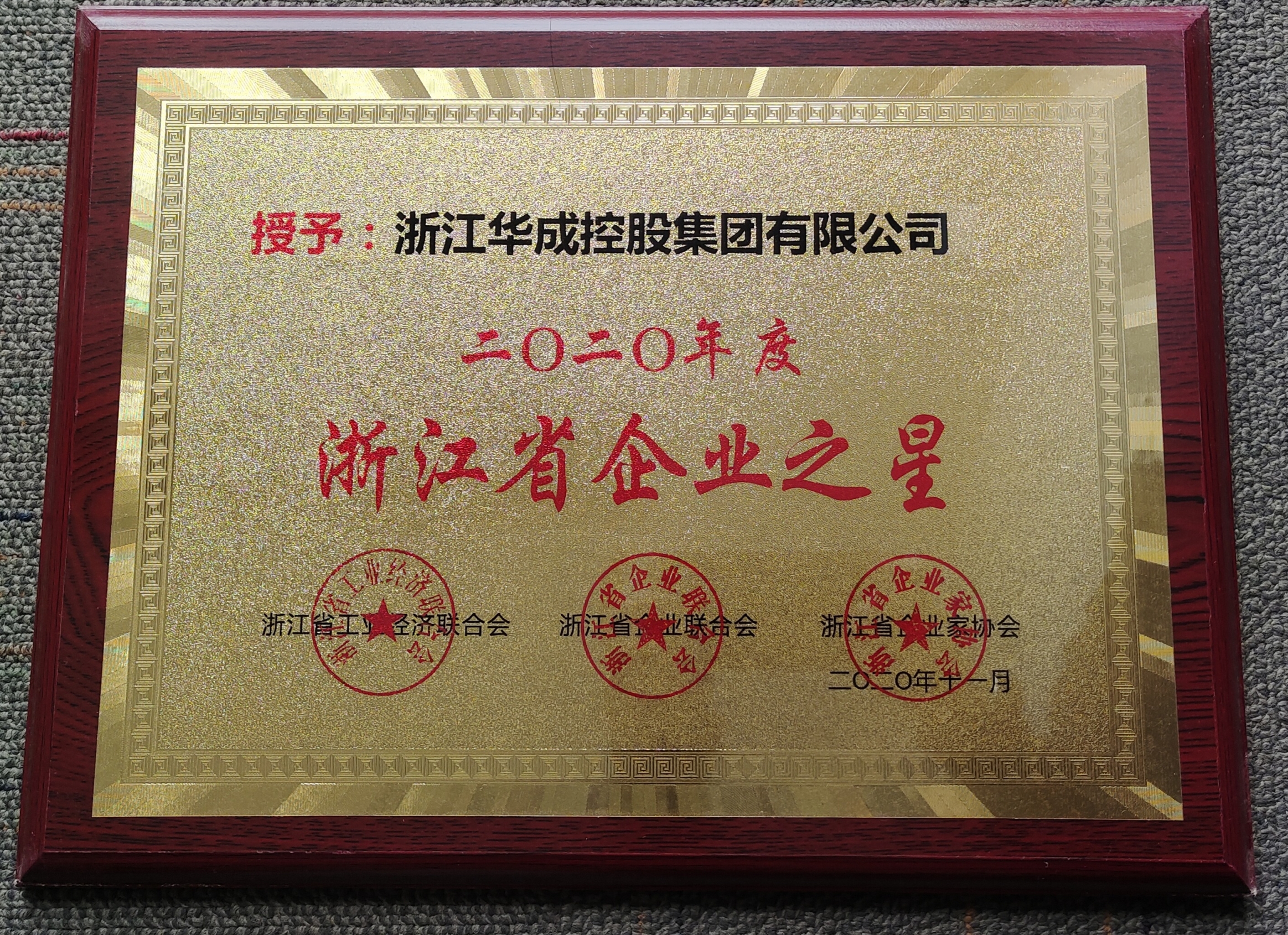 2020年11月,浙江華成控股集團有限公司被浙江省企業聯合會、浙江省工業經濟聯合會、浙江省企業家協會授予2020年度“浙江省企業之星”殊榮,并入編由省三會編撰的《浙江省企業年鑒2020》一書并榮登浙江省企業榮譽榜。